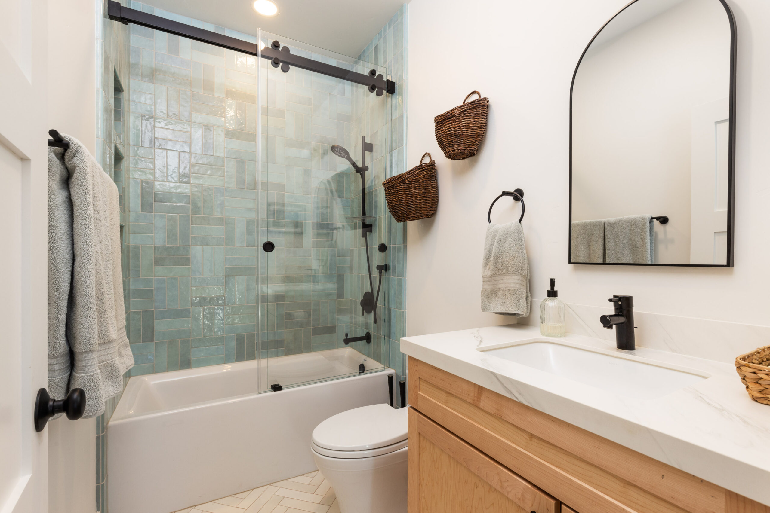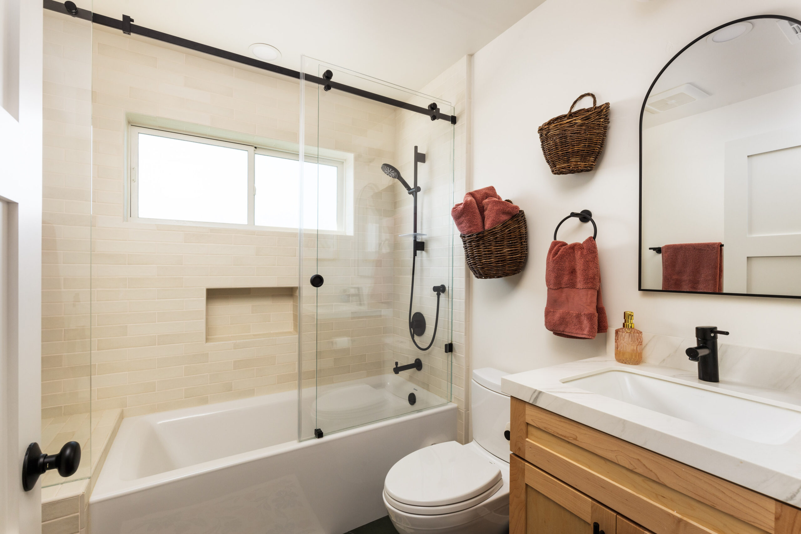 A modern bathroom remodel with double vanity, sliding closet doors, and a shower with glass doors, ceiling mounted shower head and a shower inset.